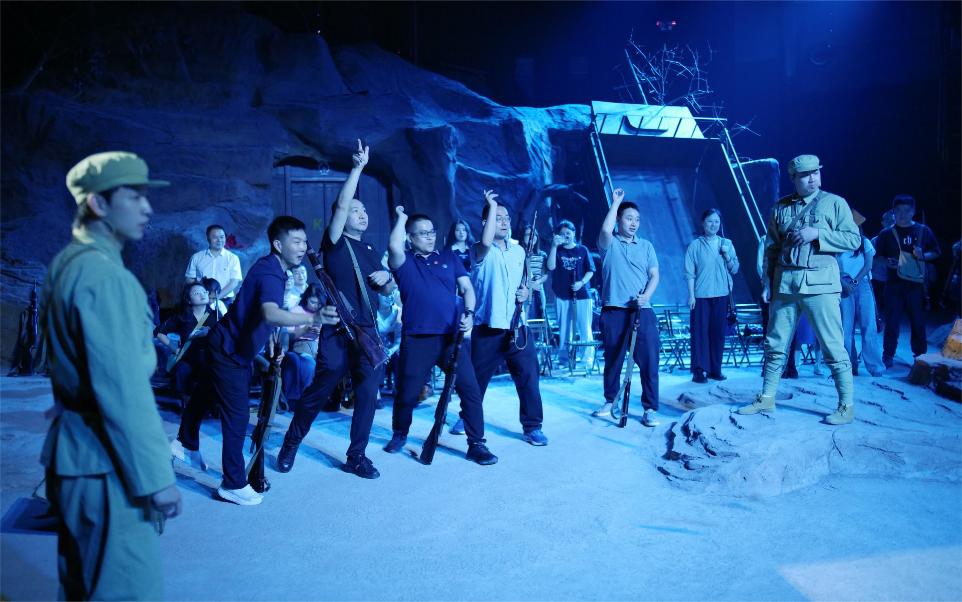 “同志們,你們準(zhǔn)備好了嗎?”“準(zhǔn)備好啦!”參觀完紅色文化長(zhǎng)廊,大家整齊列隊(duì)進(jìn)入沉浸式劇場(chǎng),在充滿歷史感的環(huán)境中,駐足2024、回望1953。通過(guò)家鄉(xiāng)話別、寫(xiě)家書(shū)、投擲手榴彈、坑道作戰(zhàn)、運(yùn)送物資等環(huán)節(jié)沉浸式體驗(yàn)硝煙彌漫的戰(zhàn)場(chǎng),先輩們的英勇事跡在全息影像中得以生動(dòng)還原,每一幀畫(huà)面都如同英雄的心跳,激發(fā)著黨員干部?jī)?nèi)心的無(wú)尚崇敬和愛(ài)國(guó)主義情懷。在虛擬與現(xiàn)實(shí)交融的舞臺(tái)上,大家觸摸歷史的脈搏,集體莊重許下弘揚(yáng)偉大抗美援朝精神建設(shè)四川水網(wǎng)的莊嚴(yán)承諾。